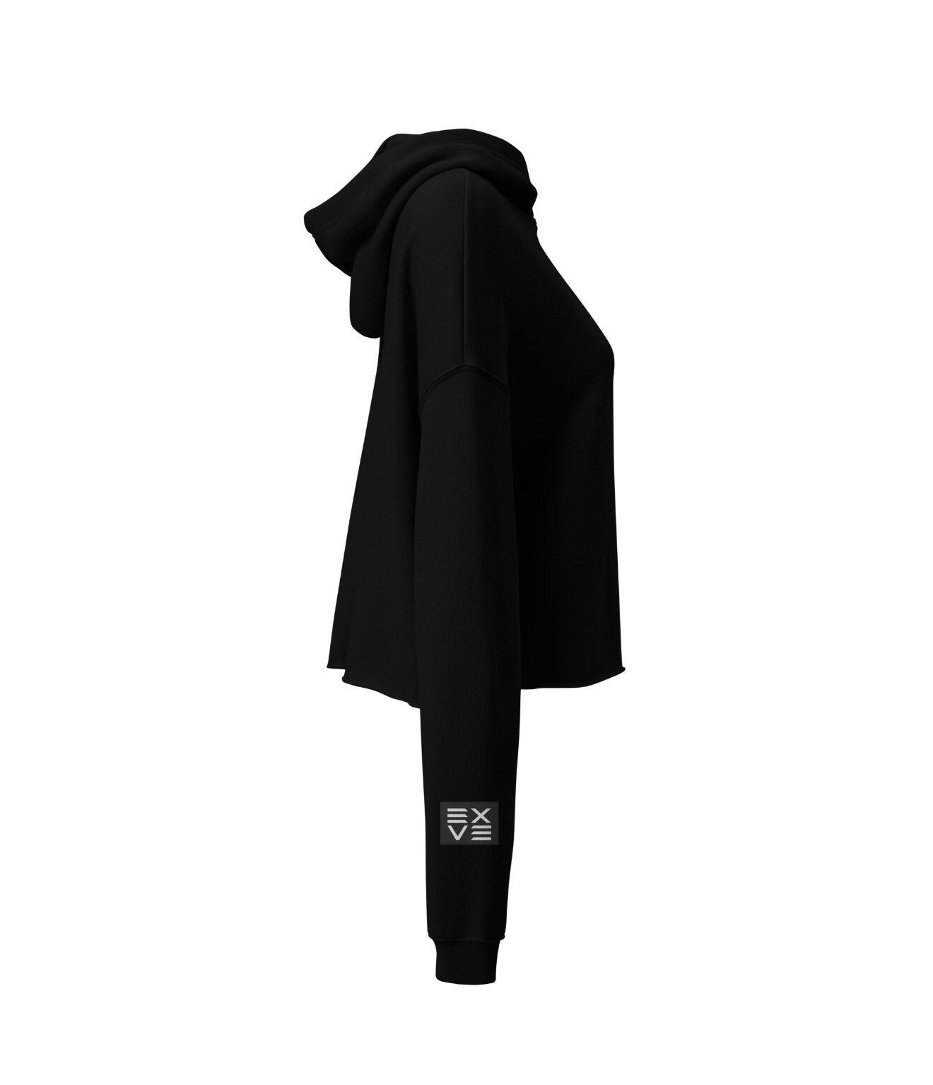 Style, Unfiltered. Designed for a relaxed yet edgy silhouette, this black crop hoodie features a raw-cut hem and sleeve-cuff branding.